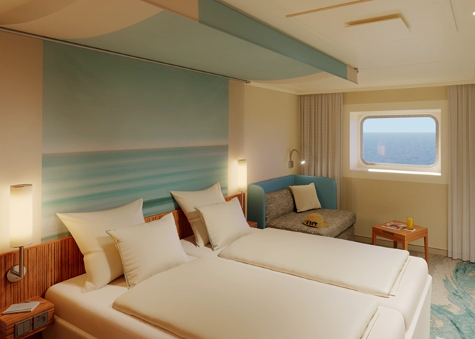 | CA - Vonkajšia kajuta PREMIUM / obmedzený výhľad 14-16,5 m². Neotvárateľné okno / obmedzený výhľad. 6. paluba. Max 2 osoby. Cenový model Premium. | 51 950 € 25 975 € za osobu |