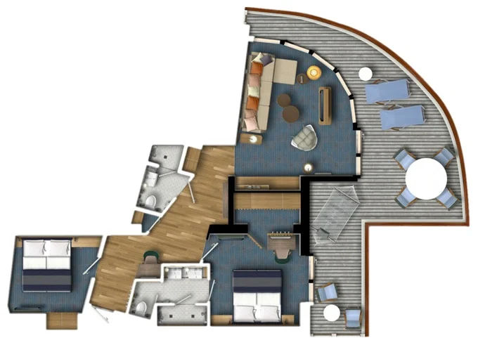 | SPNO - Panorama Suite 73-77 m² + balkón 31-36 m² so stolom, ležadlami a hojdacou sieťou. 2 spálne a 2 kúpeľne. 6,9,10. paluba. Max 6 osoby. Výhody Suite. | 8 858 € 4 429 € za osobu | ||