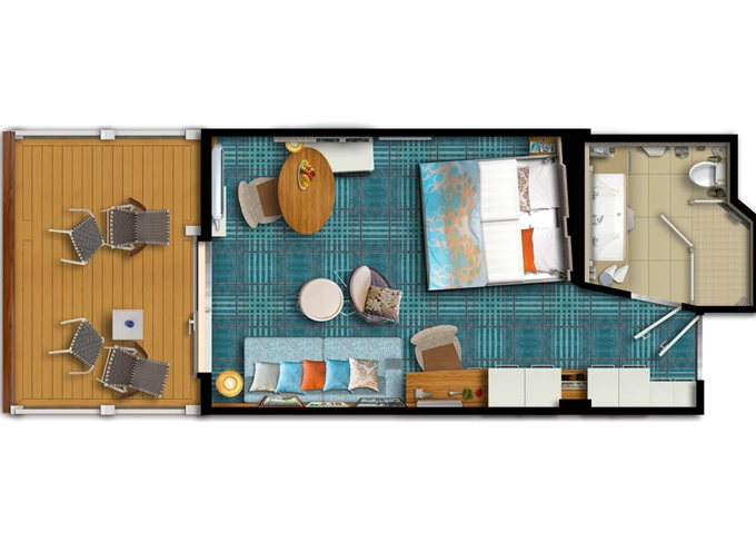 VKPO - Kajuta s terasou Premium 17 m² + balkón 30 m² s ležadlami a hojdacou sieťou. 7-11. paluba. Max 3 osoby. 4 146 € 1 382 € za osobu