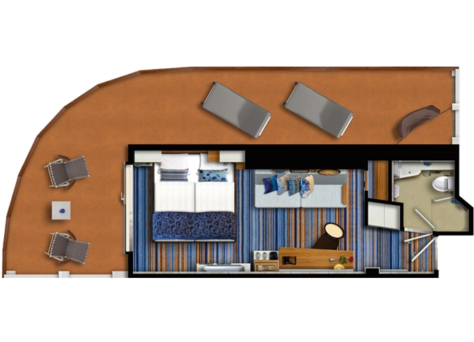 VKPO - Kajuta s terasou Premium 17 m² + balkón 30 m² s ležadlami a hojdacou sieťou. 7-11. paluba. Max 3 osoby. 3 058 € 3 058 € za osobu